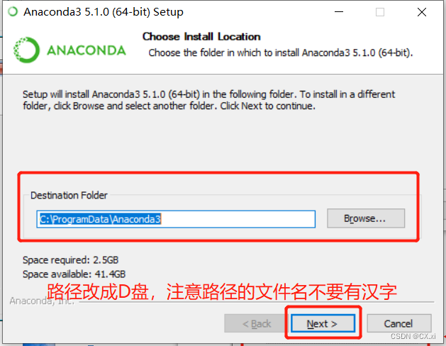 4、重新选择路径,最好在D盘,减少影响电脑速度,如果C盘很大很大,也可以装在C盘,Next