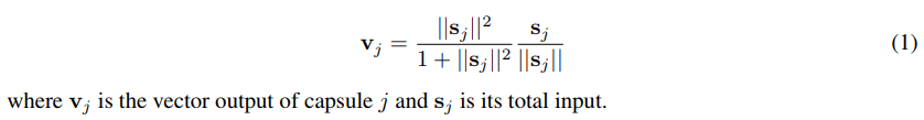 其中 v_j 为 Capsule j 的输出向量,s_j 为上一层所有 Capsule 输出到当前层 Capsule j 的向量加权和。 即 s_j 为 Capsule j 的输入向量。