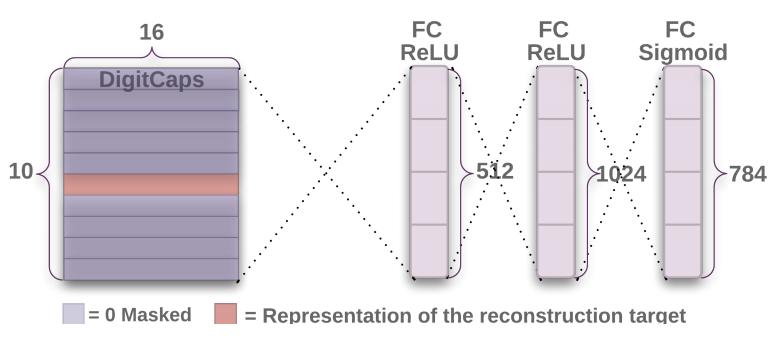 原图片可能数字重叠覆盖,导致预测出来的10个Capsules中部分Capsules的模都很大,所以重构单个数字图片时候,需要将其他Capsule进行Mask遮住,让有代表的Capsules去重构图片。损失函数通过计算在最后的 FC Sigmoid 层采用的输出像素点与原始图像像素点间的欧几里德距离作为损失函数。