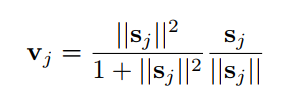 - 该非线性函数前一部分是输入向量 s_j 的缩放尺度,后一部分是输入向量的单位向量s_j.