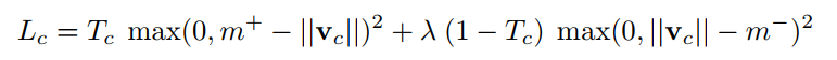 - 其中 c 是分类类别,T_c 为分类的指示函数(c 存在为 1,c 不存在为 0),m+ 为上边界,m- 为下边界。此外,v_c 的模即向量的 L2 距离。