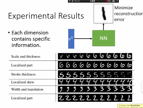 固定v1的其他维度,只改变一个维度,观察输出reconstruction network输出的结果,发现该维度的特征是控制,粗细、旋转等等。
