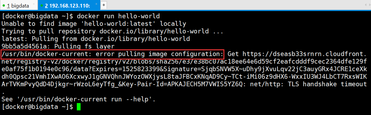 [docker@bigdata ~]$ docker run hello-world Unable to find image 'hello-world:latest' locally Trying to pull repository docker.io/library/hello-world ... latest: Pulling from docker.io/library/hello-world 9bb5a5d4561a: Pulling fs layer /usr/bin/docker-current: error pulling image configuration: Get https://dseasb33srnrn.cloudfront.net/registry-v2/docker/registry/v2/blobs/sha256/e3/e38bc07ac18ee64e6d59cf2eafcdddf9cec2364dfe129fe0af75f1b0194e0c96/data?Expires=1525823399&Signature=SjqbSNVW5X~uDhy9jXvuLqv22jC3auyGRx4JCRE1ceXkdh0Qpsc21VmhIXwAO6XcxwyJ1gGNVQhnJWYozOWXjysL8taJFBCxKNqAD9Cy~TCt-iMi06z9dHX6-WxxIU3WJ4LbCT7RxsWIKArTVKmPvyQdD4Djkgr~rWzoL6eyTfg_&Key-Pair-Id=APKAJECH5M7VWIS5YZ6Q: net/http: TLS handshake timeout. See '/usr/bin/docker-current run --help'. [docker@bigdata ~]$