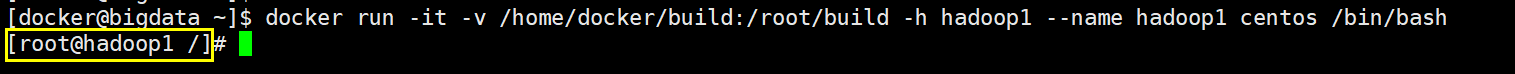 [docker@bigdata ~]$ docker run -it -v /home/docker/build:/root/build --privileged -h hadoop1 --name hadoop1 centos /bin/bash