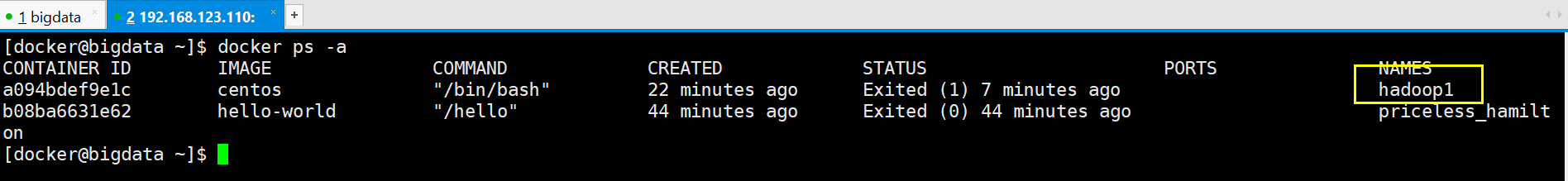 [docker@bigdata ~]$ docker run -it -v /home/docker/build:/root/build --privileged -h hadoop1 --name hadoop1 centos /bin/bash /usr/bin/docker-current: Error response from daemon: Conflict. The container name "/hadoop1" is already in use by container a094bdef9e1cac62a17022e568fe9b1eb021e13adf8ed2624a71be5a2e42c618. You have to remove (or rename) that container to be able to reuse that name.. See '/usr/bin/docker-current run --help'. [docker@bigdata ~]$