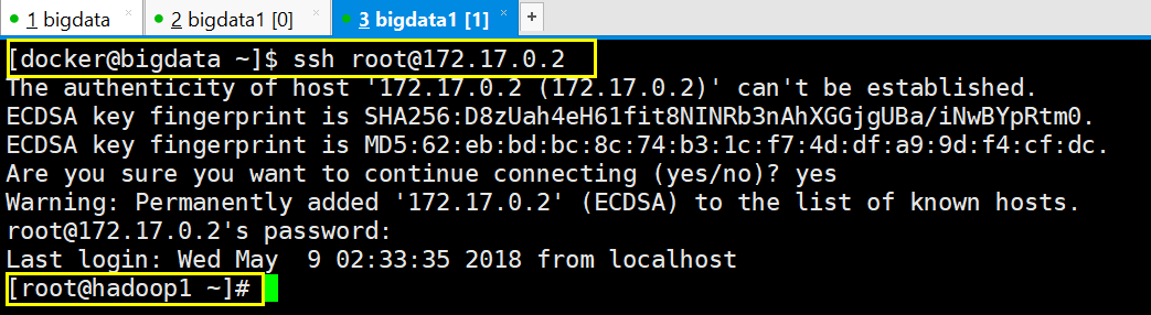 [docker@bigdata ~]$ ssh root@172.17.0.2
