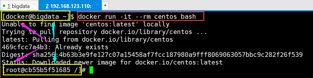 [docker@bigdata ~]$ docker run -it --rm centos bash
