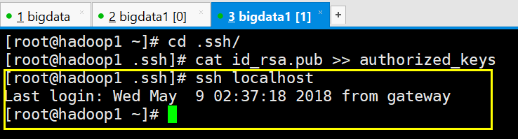 [root@hadoop1 ~]# cd .ssh/ [root@hadoop1 .ssh]# cat id_rsa.pub >> authorized_keys