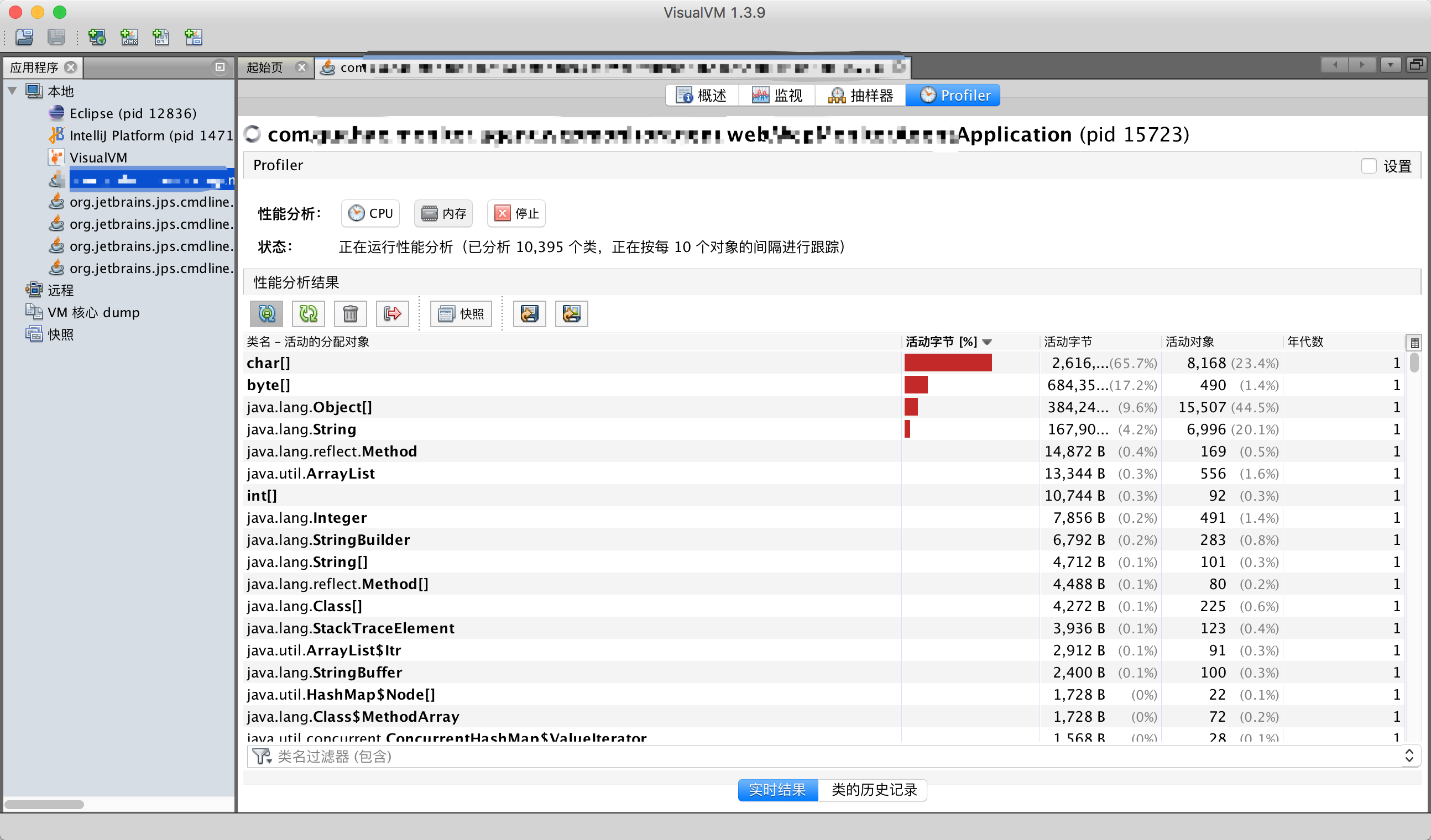 1、本地启动程序后,同时打开jvisualvm,在jvisualvm工具可视化页面有多个选项tab,可以根据需求,选择对应的tab进行使用,而我主要对profiler进行了使用,同时发现了问题,进而解决了问题,如下图所示: