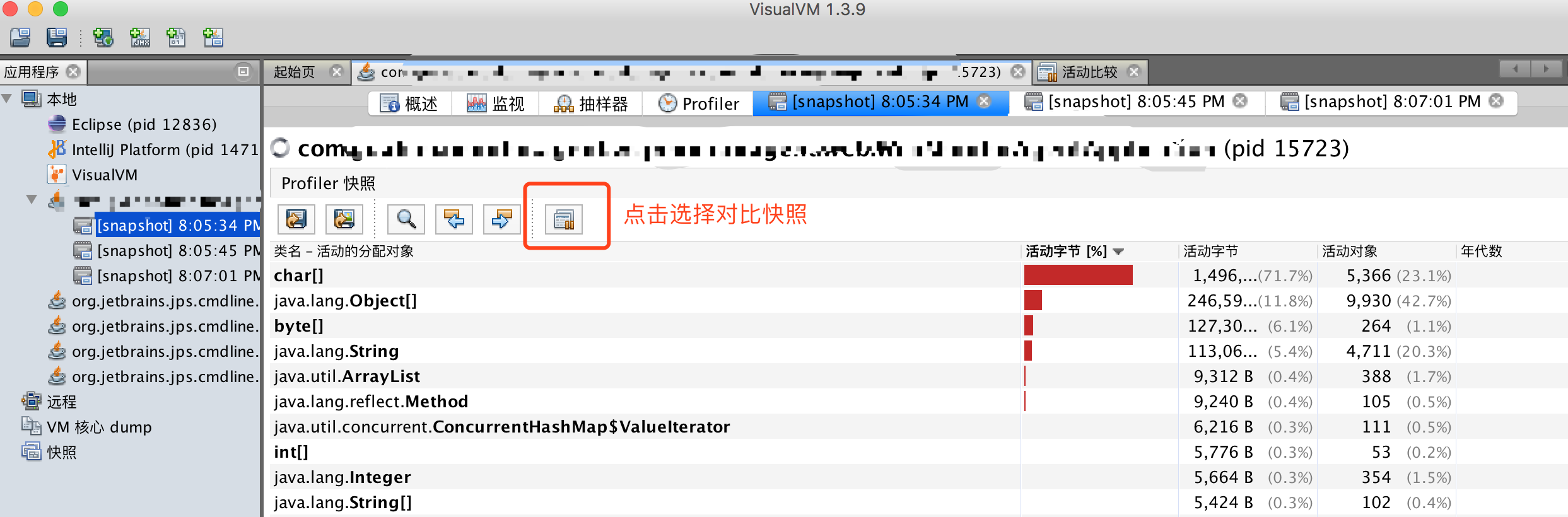 这里排查问题,主要对快照功能进行了使用,每隔一段时间进行一次快照(每次快照前,先进行一次手动gc),然后两次快照进行对比差值,进而发现内存不断增长的是哪些对象。