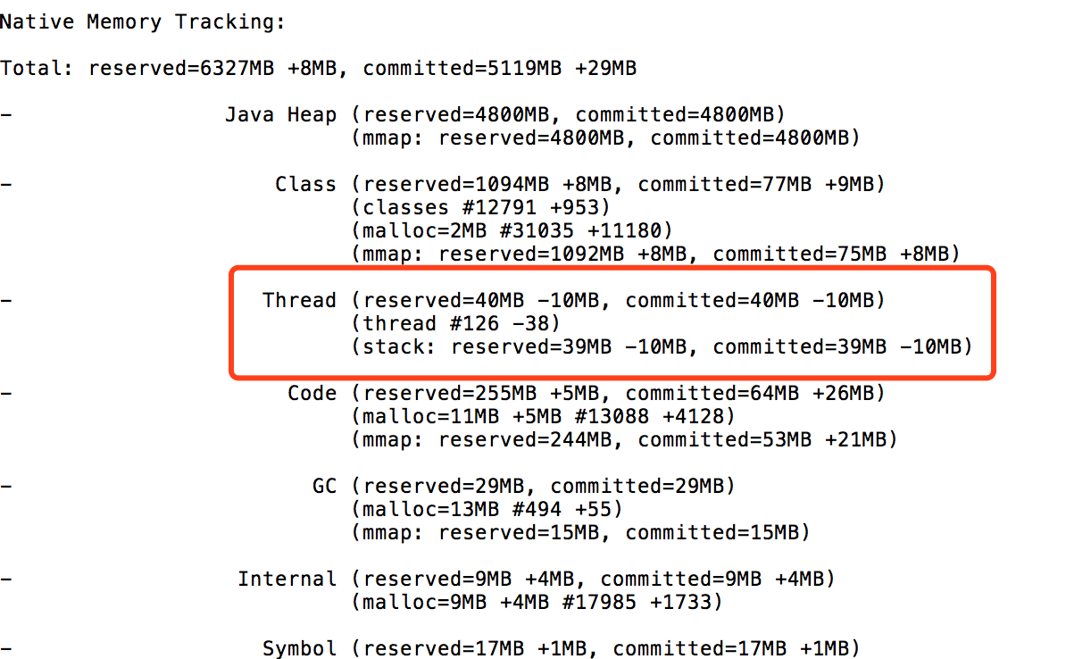 c、搞清楚每一项代表的含义,那接下来就是结合自己的代码,分析哪块可能有问题。对于我问题,通过 jcmd pid VM.native_memory baseline 设置基准线,耐心多次 jcmd pid VM.native_memory detail.diff scale=MB > a_diff.txt 看差值,然后得出有可能哪里是问题所在,比如下面是差值的一个截图,这是未解决问题前的一个比较,问题很明显: