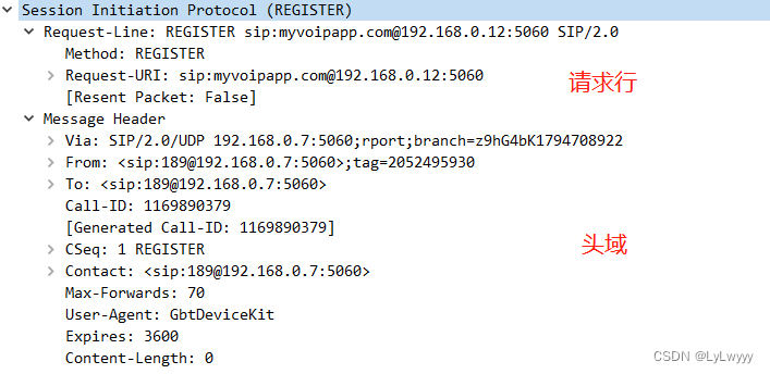 请求行例子:REGISTER sip:192.168.10.177:5060 SIP/2.0