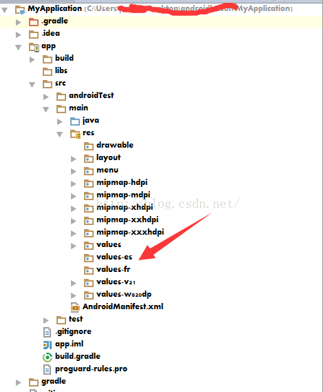 为了支持不同的语言,我们需要在res/资源目录下创建一些values文件夹,这个文件夹的命名规则为"values"+连字符"-"+ISO国家代码,比如values-fr/代表其下的资源都是为国家语言代码为"fr"的国家即法国准备的,Android系统会根据设备的区域动态加载相应的资源。假如我们希望支持西班牙语(国家代码ES)和法语(国家代码FR),我们需要建立如下的字符串资源目录:
