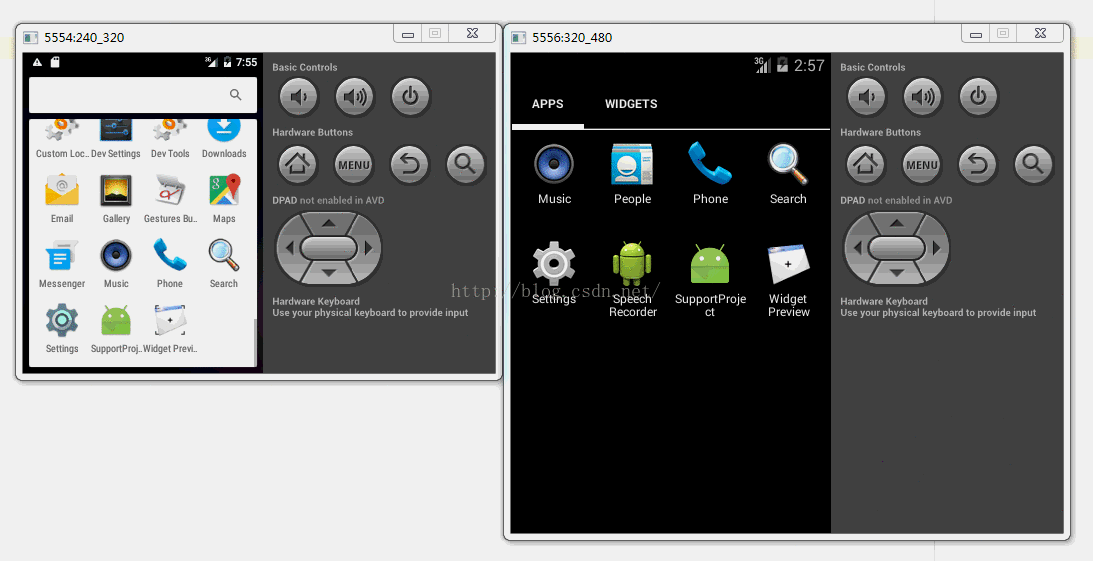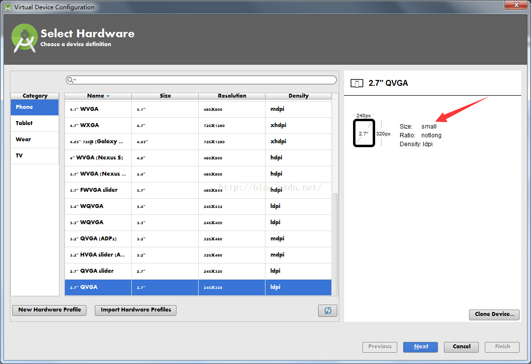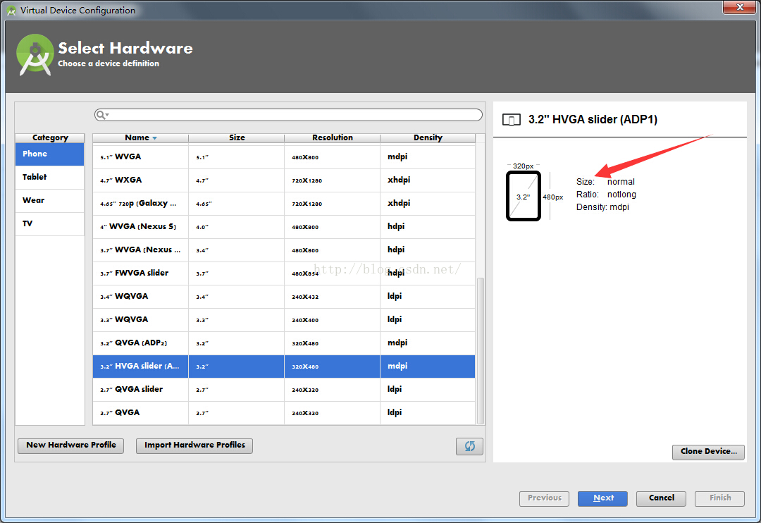 Android系统会根据手机的屏幕属性自动选择使用相应的布局资源,下面我们创建2个模拟器,一个小屏幕的,一个正常屏幕的: