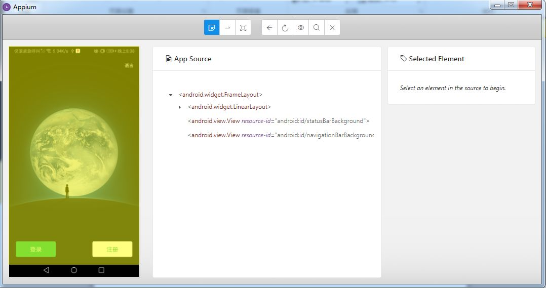 2、执行此代码也可以如第三步一样打开微信登录界面,下面就可以像selenium操作网页一样用appium对微信app界面的元素执行点击、输入等操作了,如果不知道某个按键的元素,可以在appium客户端点击某按钮,然后它的元素信息就在右侧显示出来了,如下图所示。