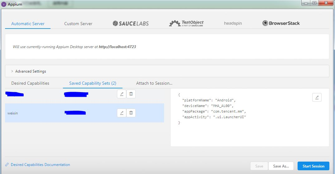 我已经配置好了参数,platformName为系统类型,deviceName为手机型号,appPackage和appActivity都代表手机app的标志,此处代表微信app,点击Start Session。