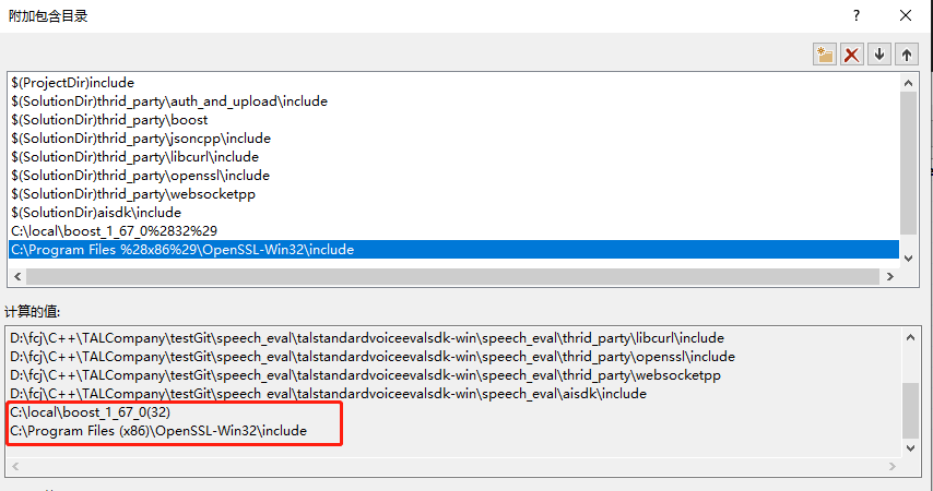 4.VC++项目配置情况如下:(也可将这些库复制到项目工程目录,注意websocketpp必然是要配置的,下面截图中红框只是boost与openssl的配置)