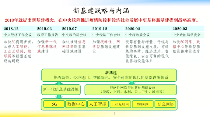 而这次在统筹推进疫情防控和经济发展中,新基建被提到了新的战略高度,邬贺铨表示,新基建的内核是集约高效、经济适用、智能绿色、安全可靠的现代化基础设施体系。