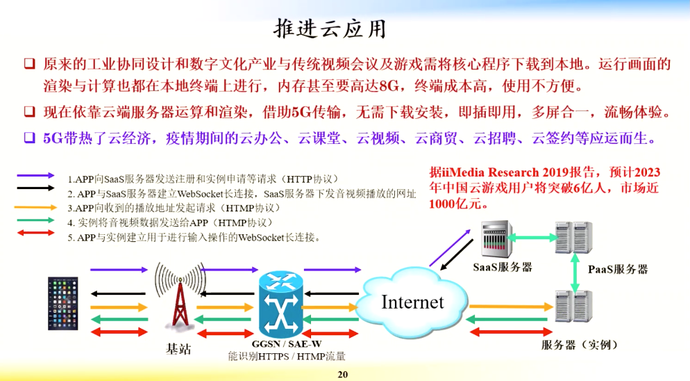 在5G赋能新经济方面,5G可以推进云应用,比如疫情期间的云办公、云课堂、云视频、云商贸、云招聘、云签约等。