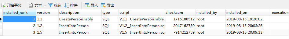 再去看数据库的日志表可以发现,数据库中已经存在version 1.2 和 1.5