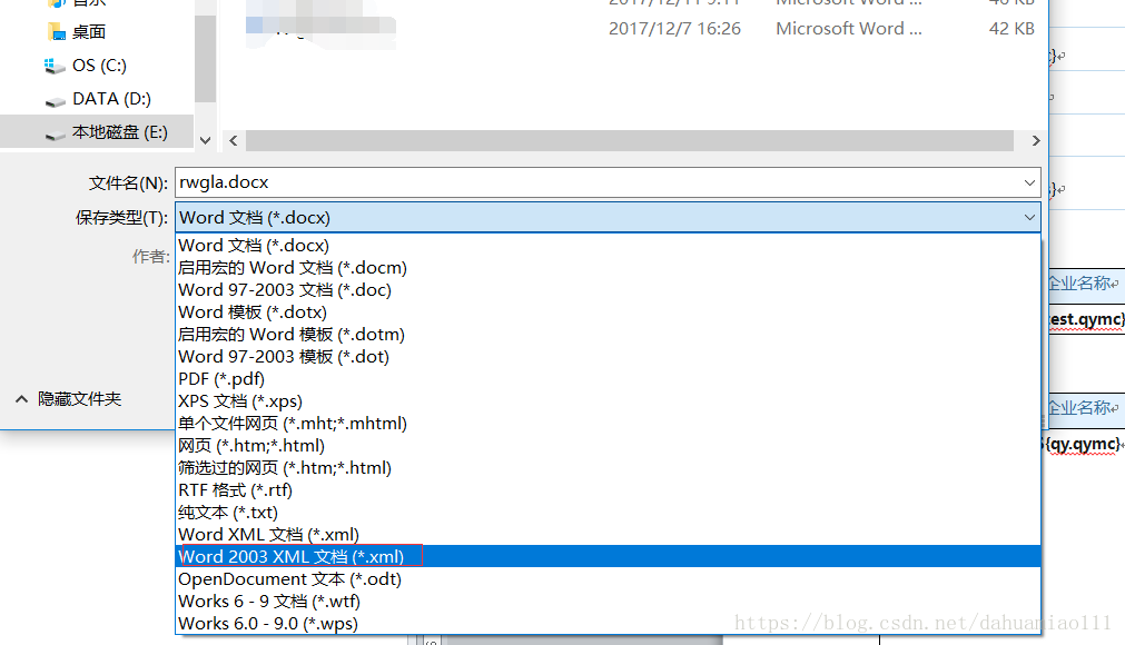 2、编辑好word模板内容后,进行另存为xml,注意保存类型为“Word 2003 XML 文档(*.xml)”