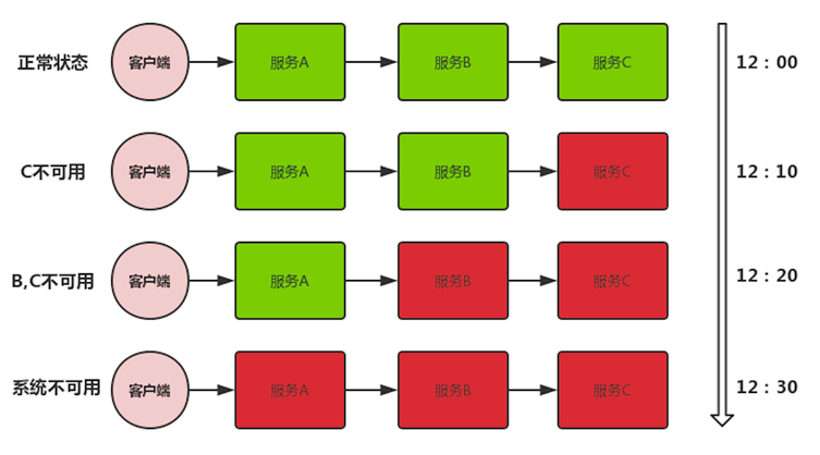 如上图所示,为服务雪崩效应发生的过程,首先是服务正常状态,当客户端对服务 A 发起请求,服务 A 依赖了服务 B,服务 B 又依赖了服务 C,当所有服务都处于正常状态时,整个请求链路是通畅的,结果会很快返回给客户端。