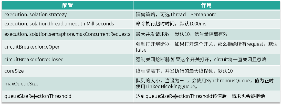 Hystrix 的配置项比较多,在这里整理了几个比较常用的配置,所有的配置基本上都有默认值,如果我们需要调整这些配置,可以参考 PPT 中给出的链接。