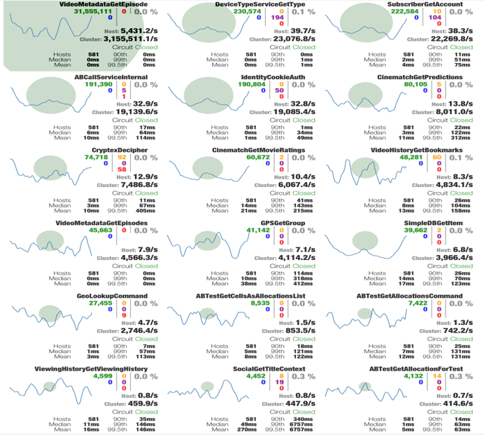 这张图是 Hystrix 官方提供的,通过 Dashboard 将请求的情况展示出来,每一块都是一个Command,Command 区域背景色的圆圈越大表示流量越大,绿色的数字表示请求成功的短路的计数,当断路器处于打开状态时,被拦截的请求就是短路的数量。黄色的数字表示超时的请求数,紫色数字表示请求被拒绝的数量。红色的数字表示请求失败的数量。