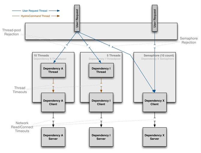 Hystrix 支持线程池和信号量两种隔离方式,线程池隔离是当用户请求到 A 服务后,A 服务需要调用其他服务,这个时候可以为不同的服务创建独立的线程池,假如 A 需要调用 B 和 C,那么可以创建 2 个独立的线程池,将调用 B 服务的线程丢入到一个线程池,将调用 C 服务的线程丢入到另一个线程池,这样就起到隔离效果,就算其中某个线程池请求满了,无法处理请求了,对另一个线程池也没有影响。