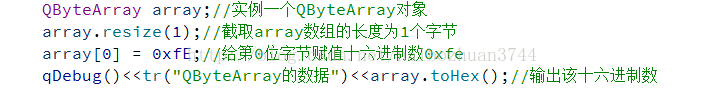 上述结果表明,array数组的长度为1个字节,可以直接用十六进制数赋值给array数组的第0字节,即代码array[0] = 0xfE; 当赋值完十六进制数后,这个十六进制数就占用array数组的一个字节,查看该字节的内容时,可以用函数toHex()将这个十六进制数(占空间一个字节)显示出来。用qDebug类可以完成,即代码qDebug()<<array.toHex(); 可以实现该功能。当然,赋值十六进制也可以用字符来表示'x0fE' == 0xfE ,即'x0fE'跟0xfE是等效的。