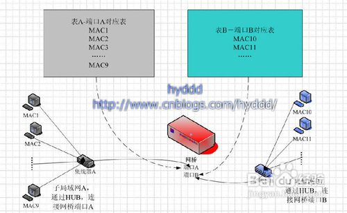 一开始的时候,表A和表B都是空的,没有一条记录,这时,网桥会把数据包转发给B网络,并且在表A中增加一条MAC地址(把源MAC地址记录表中),说明这个MAC地址的机器是A子网的,同理,当B子网发送数据包到B端口时,网桥也会记录源MAC地址到B表。