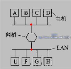 从图中可以看到,网桥只有2个输入/出端口,而交换机有8个。嗯,是的,一开始的时候(那时候只有HUB这种设备),由于硬件水平不是很发达,人们为了提高局域网效率,减少广播风暴的出现,他们生产了网桥(一个只有两个输入/出端口的链路层设备,这时的网桥已经是个比较先进的设备),然后他们把一个局域网一分为2,中间用网桥连接,这样A发给BCD的数据就不会再广播到EFGH了(网桥发现如果数据包不是转发给下面这个子网的,它会自动丢弃此包),只有从A 发到EFGH的数据包才能通过网桥,到达另外一个子网(网桥发现如果数据包是转发给下面这个子网的,它才会把包转发给这个子网)。