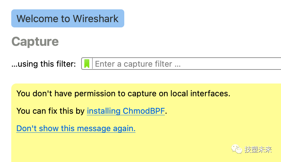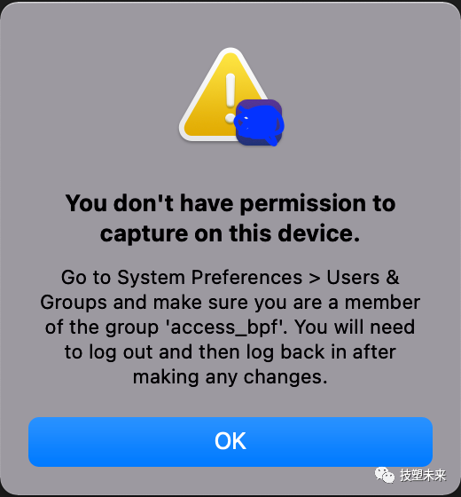 所以上面提示无权限抓包,以及“access_bpf”用户组问题,其实是需要先安装Wireshark,解决BPF的权限问题。于是下载安装Wireshark,果然提示要“installing ChmodBPF”: