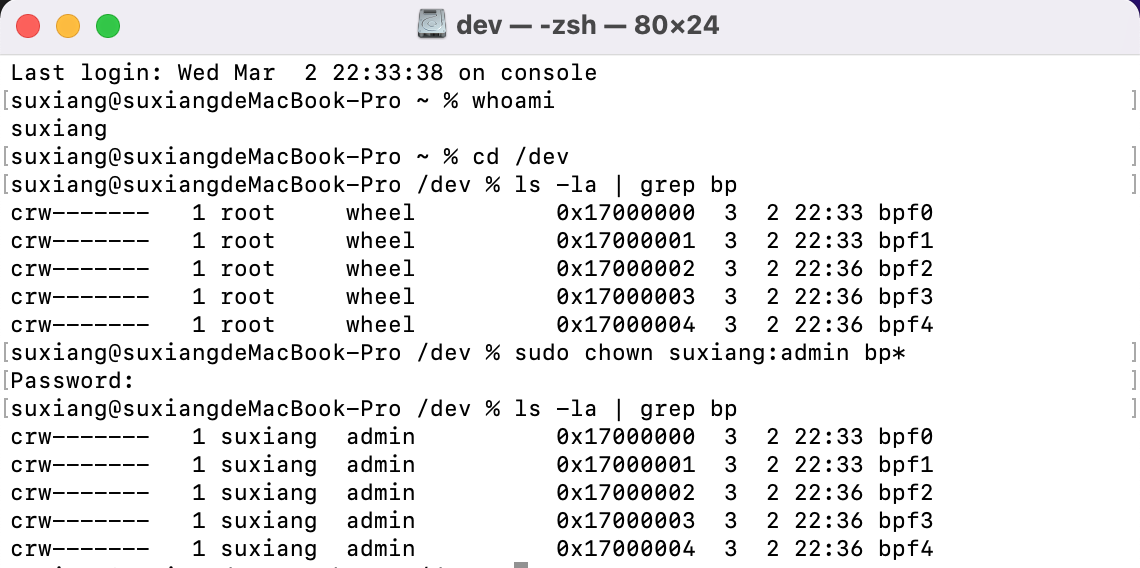 # 在终端命令行工具中,输入whoami查看当前用户whoami# 然后切换到/dev下查看bpf相关设备cd /devls -la | grep bp# 从下图可以看到bpf的权限,然后按照网络搜索的输入如下命令修改bpf设备权限sudo chown 当前用户名:admin bp*# 但是使用上述命令还是不起作用,而且重启电脑后发现权限还是会被恢复回去