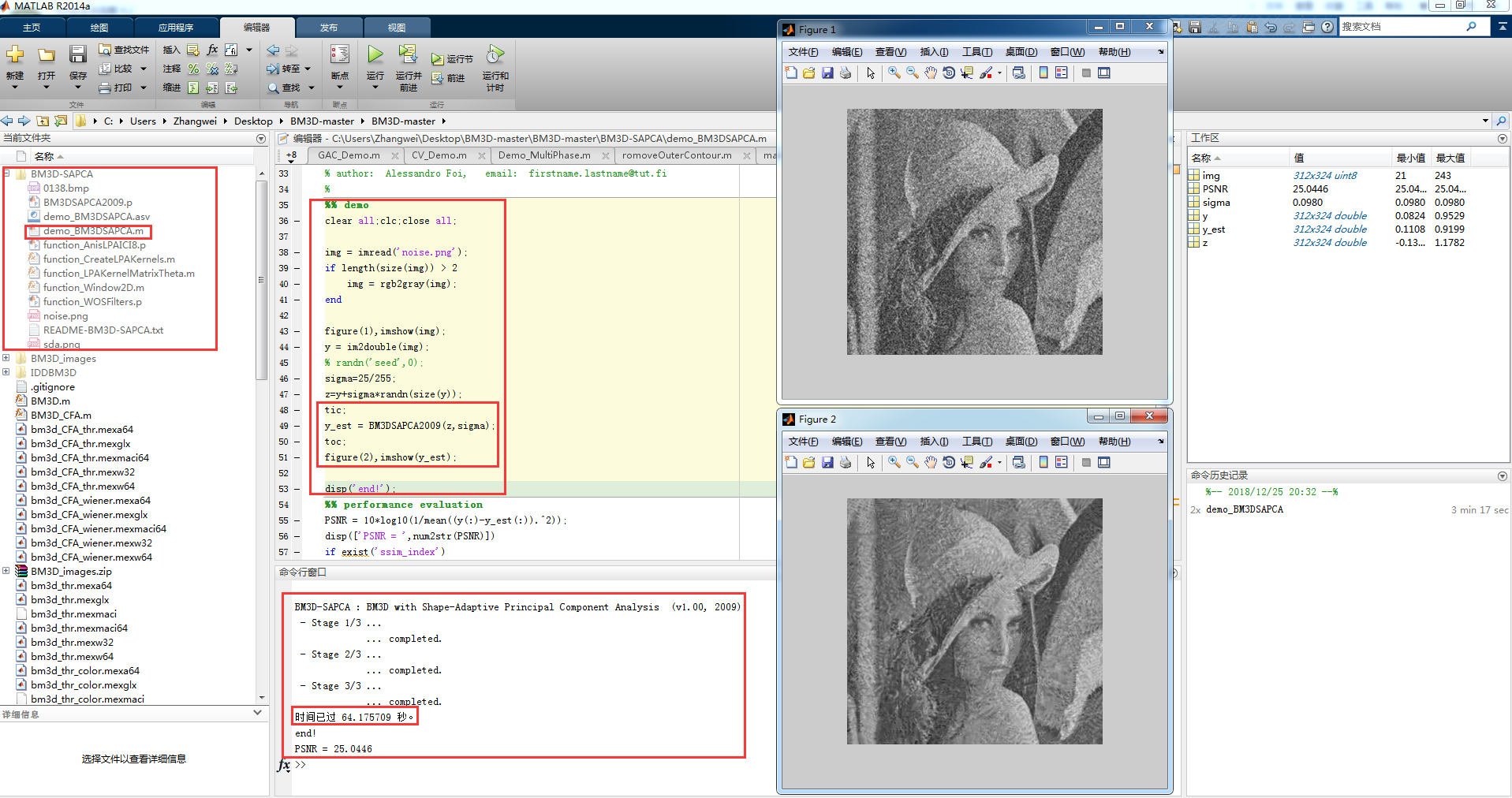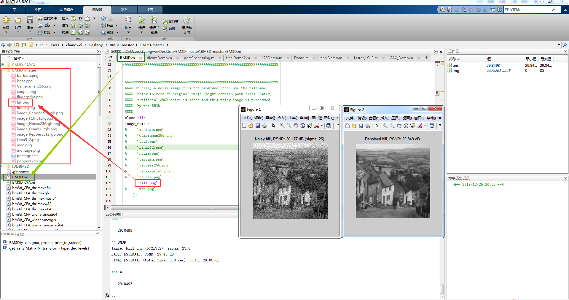 (2) 运行官网提供的代码BM3D.m文件: