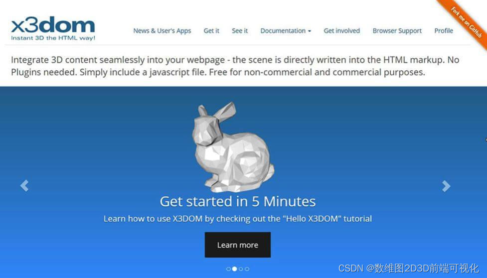X3DOM是一个框架,用于将(X)3D场景集成和操作为HTML5 DOM 元素,通过 WebGL 渲染,无需额外的插件。 开源系统允许定义 3D 场景描述和运行时 声明性行为,没有任何低级 JavaScript 或 GLSL 编码。