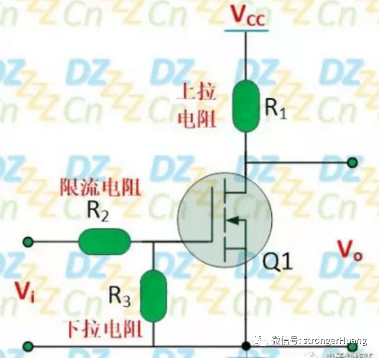 栅极串联电阻R2为限流电阻,防止输入电压变换的瞬间导致栅极电流超额而损坏场效应管,下拉电阻R3用来确保无输入信号时(即悬空)时场效应管处于截止状态。