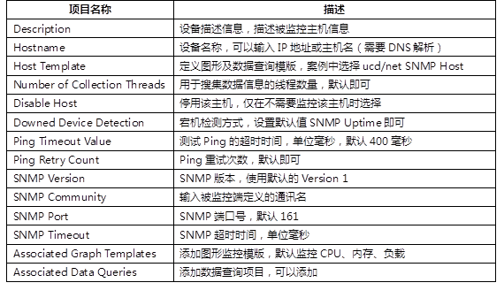 登录Web控制台后,进入Devices菜单后点击Add添加被监控主机,如图-2所示。此时系统会要求填写相关表单信息,需要填写的项目参数描述见表-1,填写完所需项目表单后点击右下角的Create即可创建新的设备主机,同时在下方会出现图形模版以及数据查询模版,管理员可以根据实际需要继续添加需要监控的参数对象,确定后点击Save保存所有设置,效果如图-3所示。