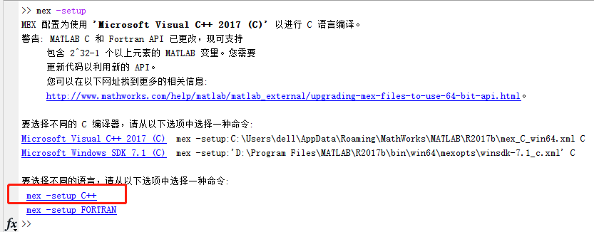 在matlab命令行中输入 mex -setup,选择如下