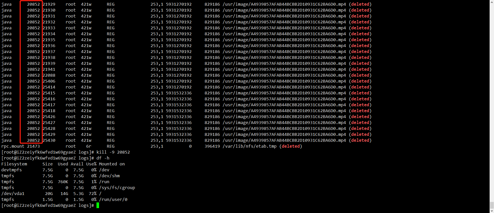 3、查看被删除了的所有文件:lsof -n |grep deleted,结果如下: