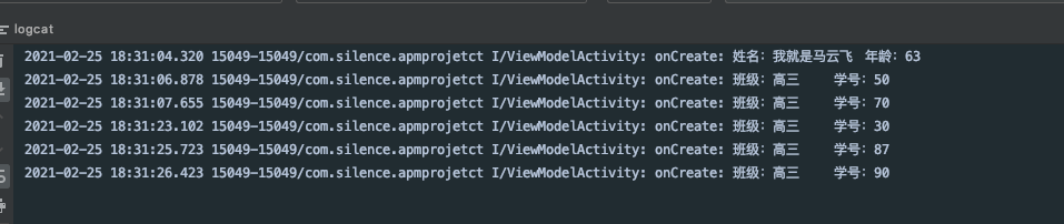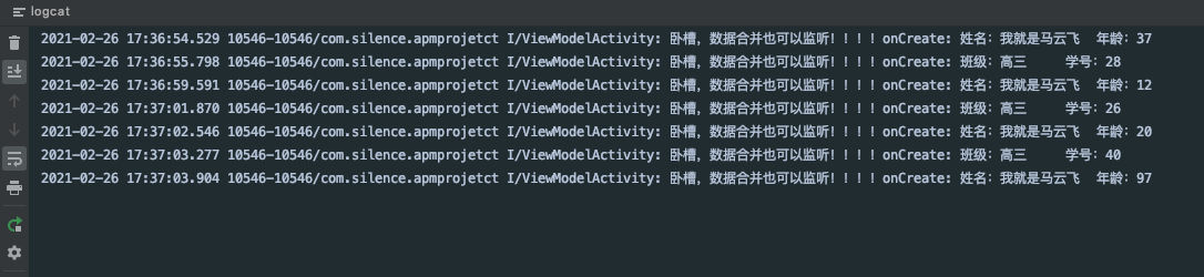 我们在Activity中对viewModel的userData做了监听,实时观察数据的变化。那么我们现在进行点击看看效果如何: