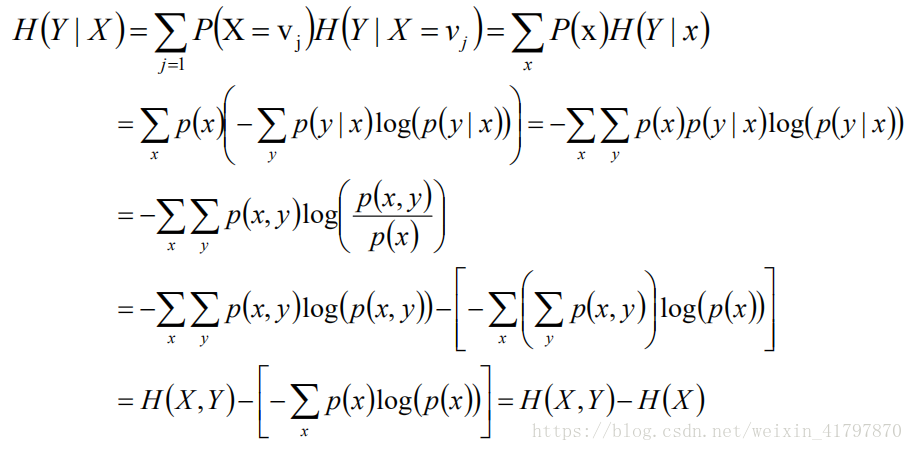 事件(X,Y)发生所包含的熵,减去事件X单独发生的熵,即为在事件X发生的前提下,Y发生“新”带来的熵,这个就是条件熵本身的概念。