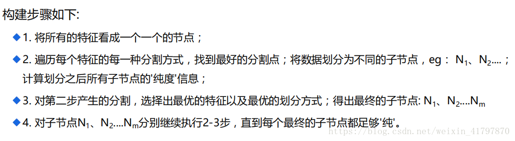 决策树构建的重点就是决策树的构造。决策树的构造就是进行属性选择度量,确定各个特征属性之间的拓扑结构(树结构),构建决策树的关键就是分裂属性,构建决策树的关键步骤就是分裂属性,分裂属性是指在某个节点按照某一特征属性的不同划分构建不同的分支,其目标就是让哥哥分裂子集尽可能的“纯”(让一个分裂子类的项尽可能的属于同一类别)