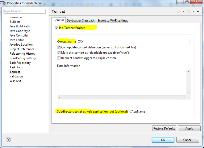 - <ContextdocBase=“D:workspaceWebAppAppName"path=”/XXX"debug="0"reloadable=“false”/>