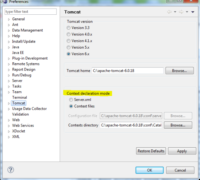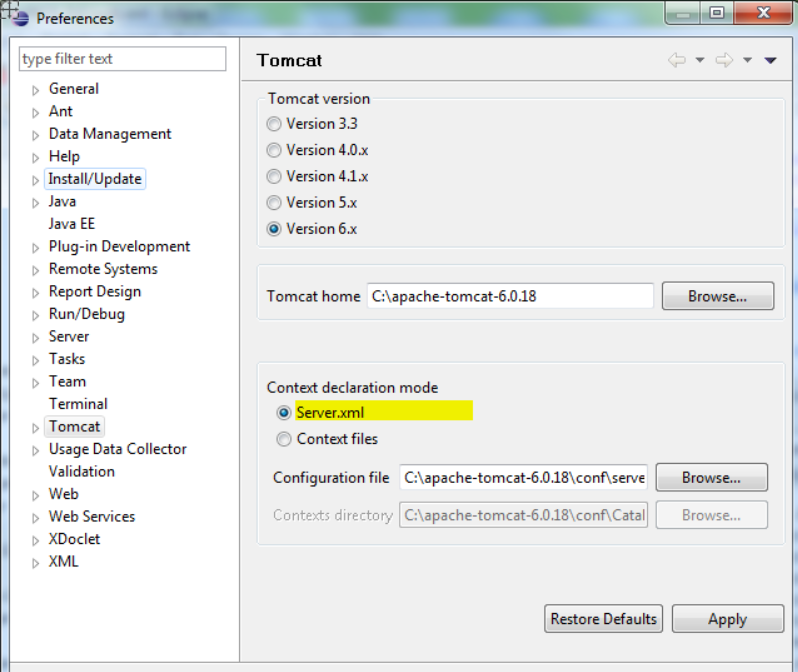 当然如果使用Eclipse,在Eclipse中的设置也有改变:打开菜单栏window选择preference(首选项)——左侧选择Tomcat——可以看到上图中高亮画出的Context declaration mode(Context 声明模式)中选择以Server.xml文件来部署web应用。