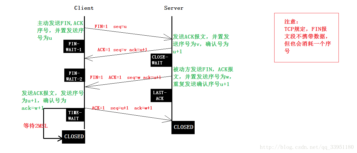 ·Client收到释放报文段后发送确认报文段。此时Client并没有释放掉连接,而是进入TIME-WAIT(时间等待)状态,等过了2MSL时间后才进入到CLOSED状态。