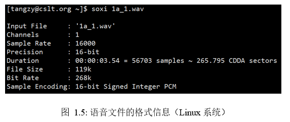 语音的基本保存形式可用波形图(Waveform)展现出来,如图1.3所示,可以简单地看作是一串上下摆动的数字序列,比如,每1秒的音频可以用16000个电压数值表示,即采样率为16kHz。进一步聚焦放大波形图,可以清晰地看到每个采样点,如图1.4所示。真正的语音不需要额外的注解,但对于数字化的语音来说,还需要额外的信息对文件格式进行说明,如信道、采样率、精度、时长等,并有文件大小=格式信息+信道数*采样率*精度*时长。可以用soxi查看文件信息,如图1.5所示。