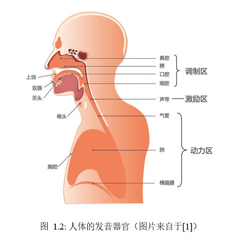 图1.2展示了人体的发音器官及其对声音的影响区域。简而言之,肺部产生气流动力,经过气管引起声带振动形成声源(通常称为激励,图中激励区也叫声源区),最后经过声道(咽腔、口腔、鼻腔等区域)调制后由口唇辐射出来,产生了我们所听到的语音。当我们说话、唱歌时,基本上所有的发声器官都被调用了;当我们哼着小曲时,口腔可以不动,而只通过调动鼻腔来调节音调;当我们捂着口鼻时,气流停止,没了动力,渐渐就发不出声音了。