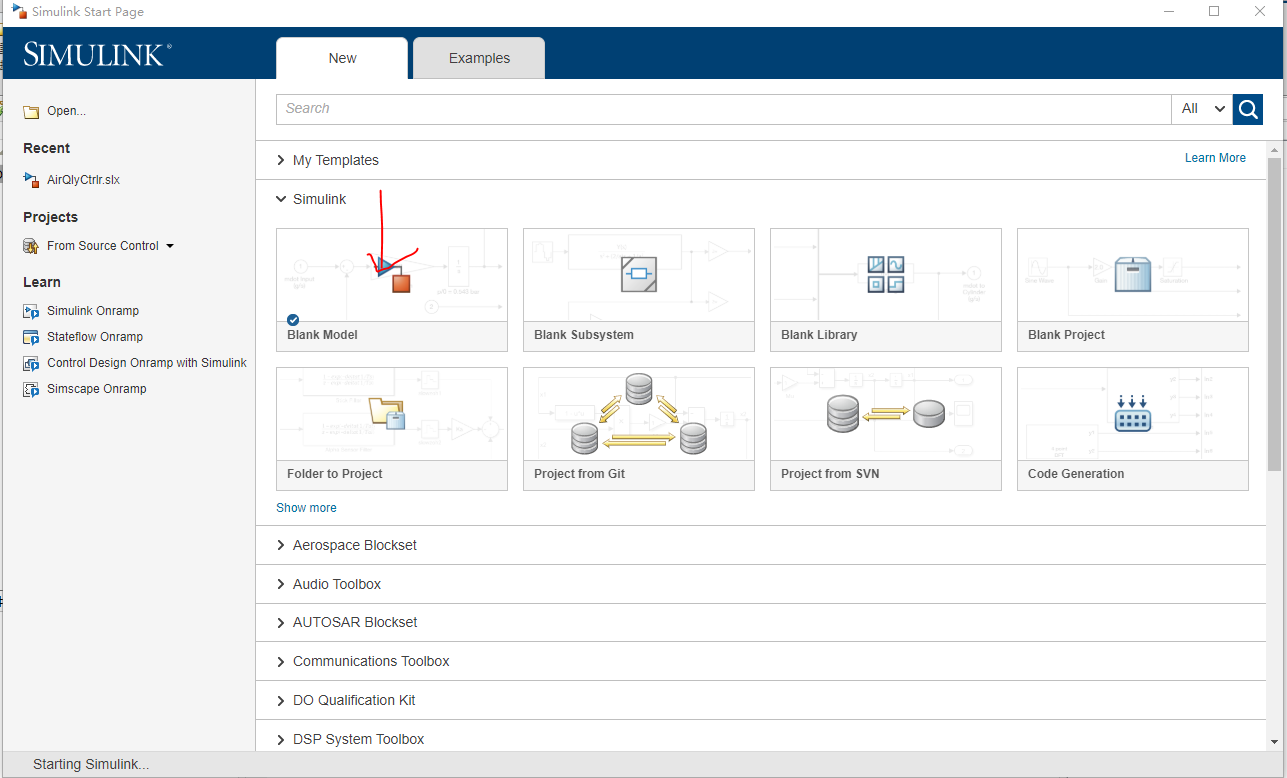 鼠标左键单击blank model,即可以创建一个空的simulink模型。见下图