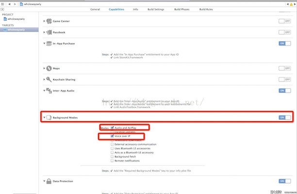 <二> 在plist文件中的Required background modes这一项中新增以下两项(默认项目中是没有这一项的,需要手动添加):App play audio or streams audio/video using AirPlay 和 App provides Voice over IP services 。IOS7中没有这么麻烦,可以直接点击项目文件,勾选以下两项: